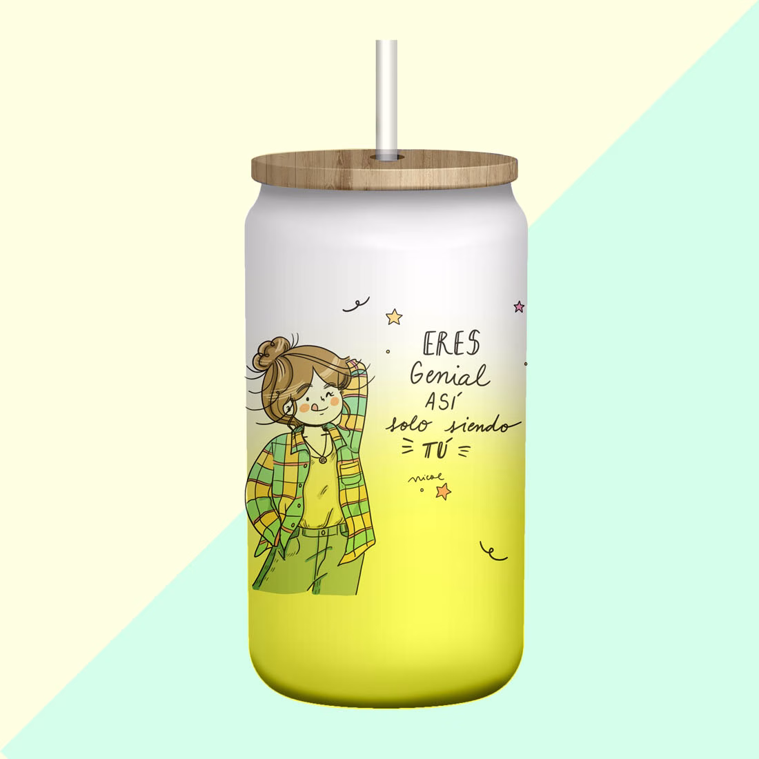 Vaso Genial color amarillo con tapa de bambú y bombilla